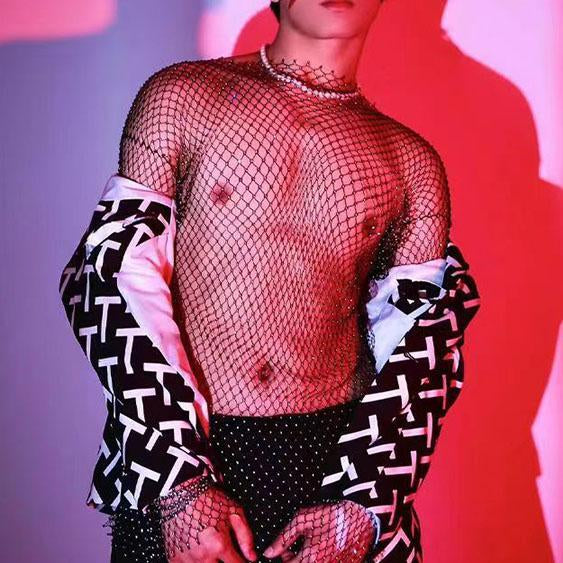 Beaded hollow out long sleeve fishnet see through top