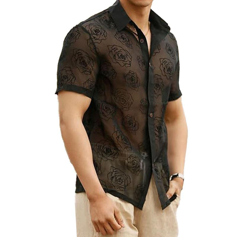 Short sleeve turnover collar print button see through top