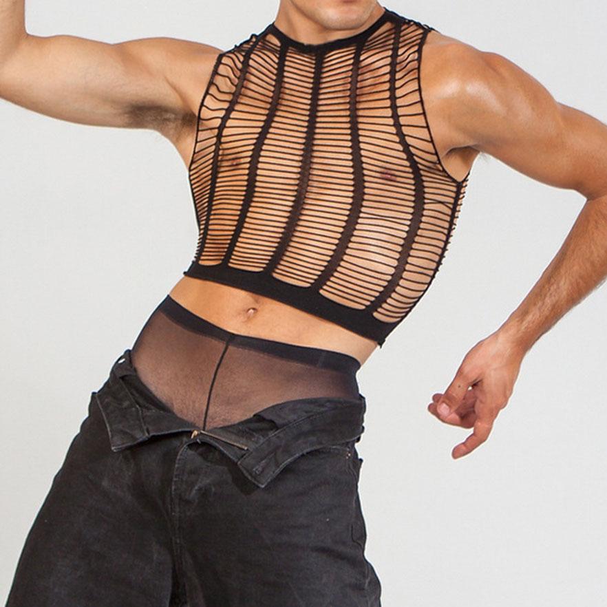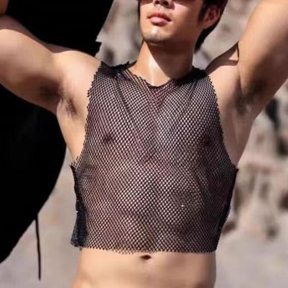 Sleeveless crewneck hollow out see through fishnet top
