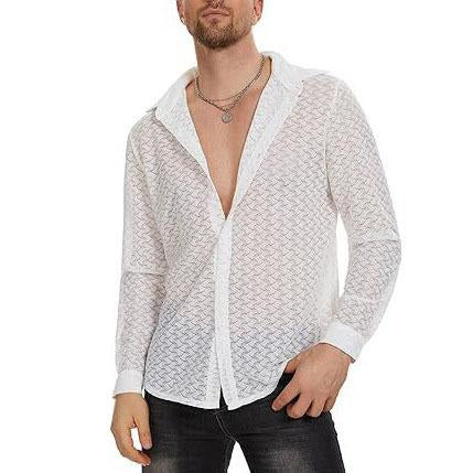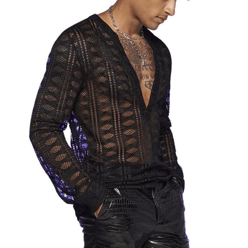 Turnover collar hollow out short sleeve lace hem solid top | men stripper wear | male stripper outfit