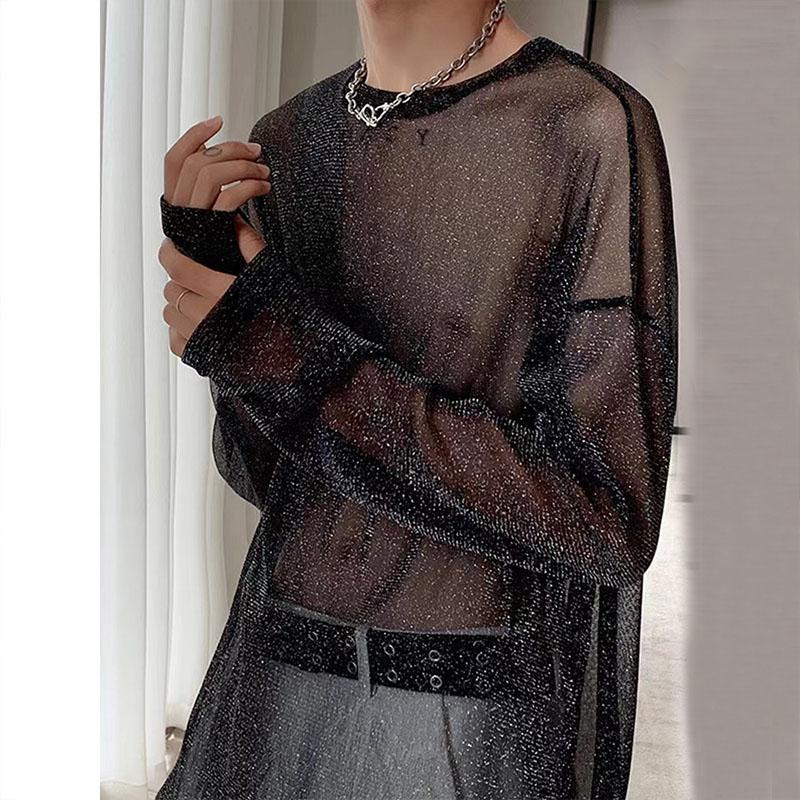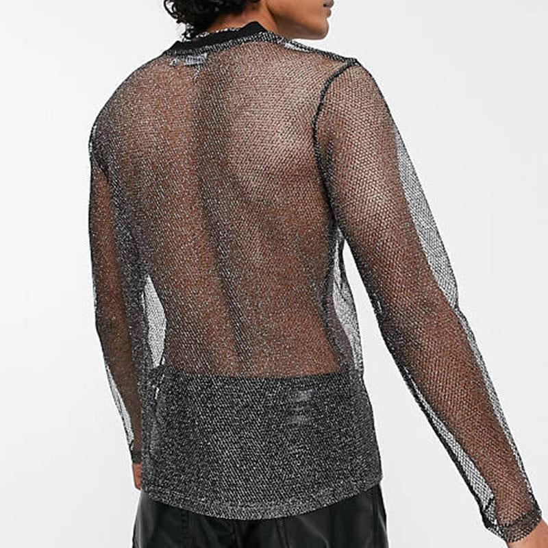 Sheer mesh see through long sleeve crewneck solid top