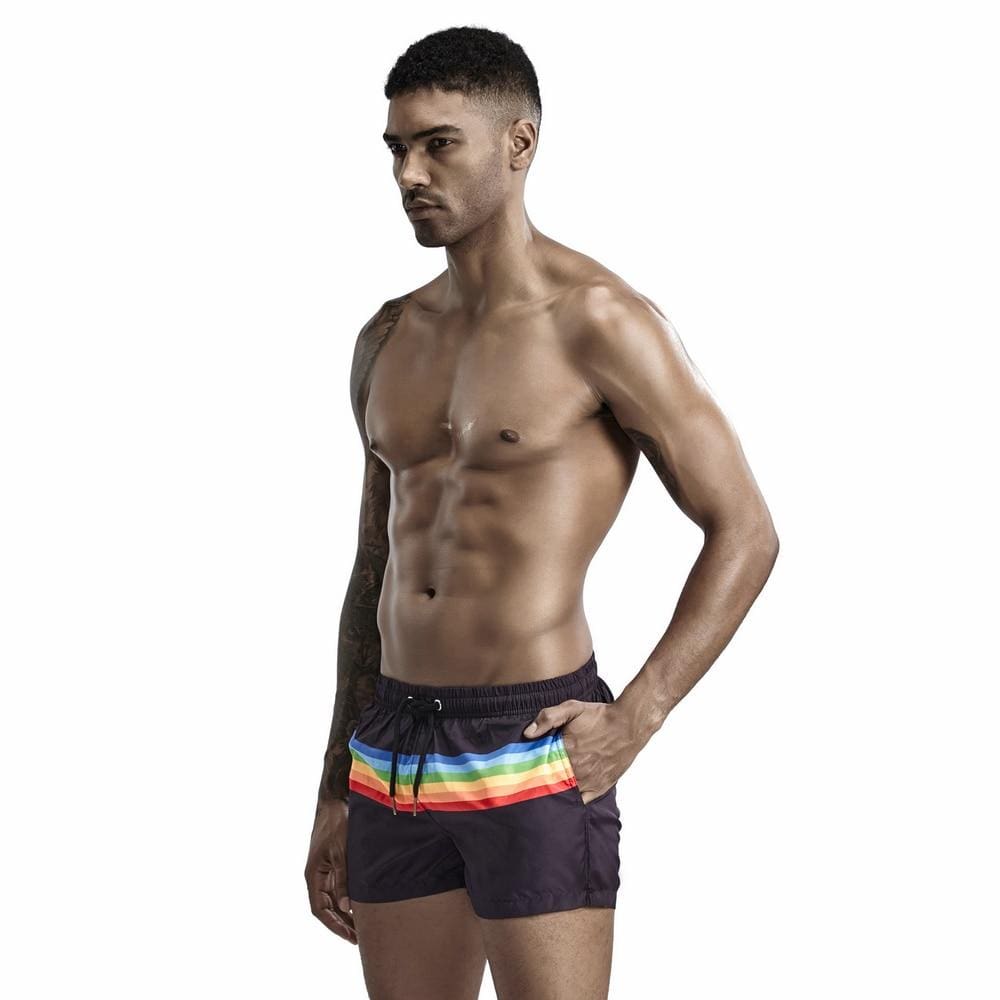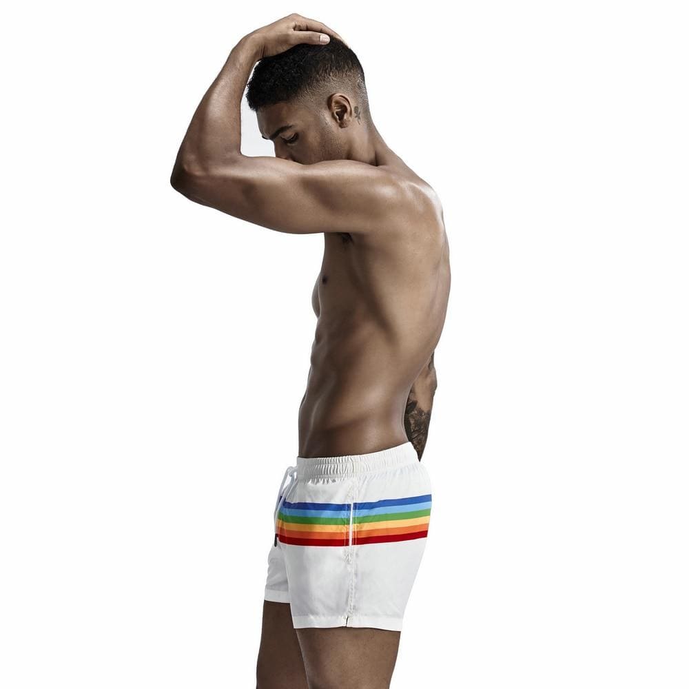 Be the envy of the beach and show your pride in these fashionably short swim shorts with a colorful rainbow stripe. They have a classic cut and style. are quick-drying. are sure to attract the best attention.