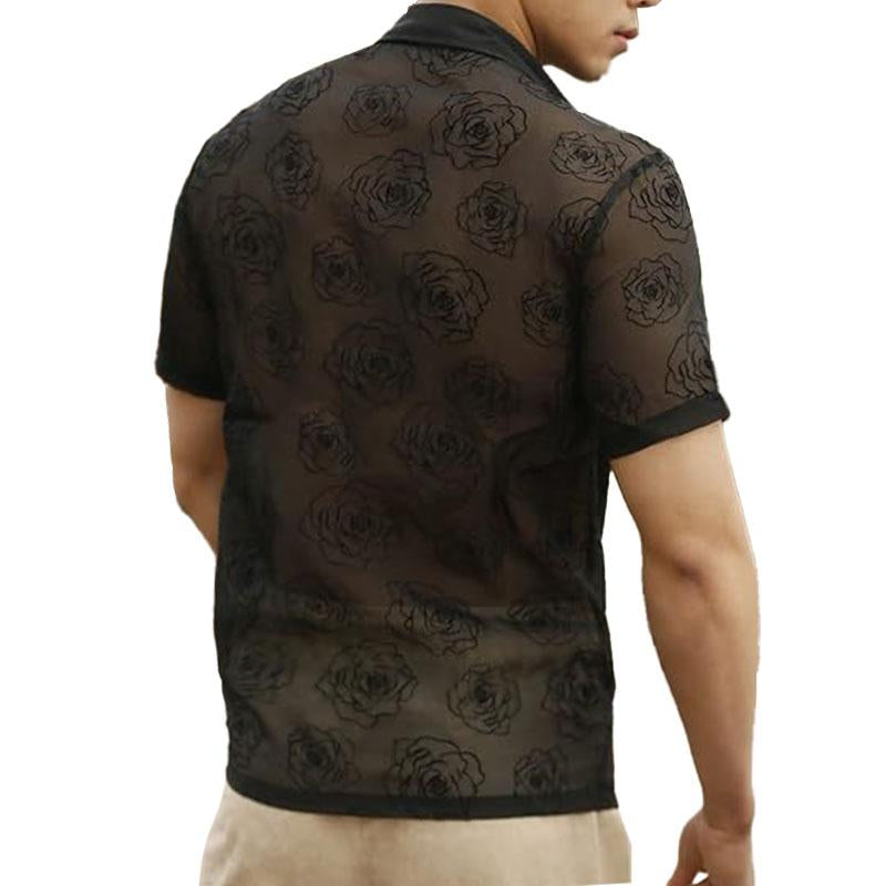 Short sleeve turnover collar print button see through top