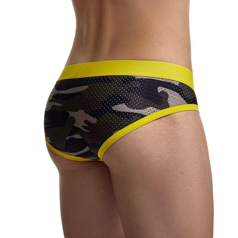 A simple camo mesh brief with a vibrant pop of color!