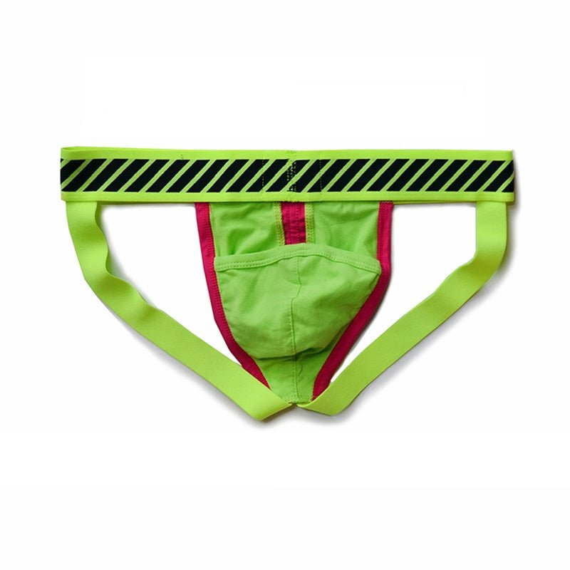 Take your style up a gear with the DM Racing Stripe Jockstrap! Featuring bold colors. contrasting stripes. and a daring hazard tape band. this jockstrap gives a fearless look to your wardrobe. Not only that. but there is a pocked inside so your package wont go flying around!
