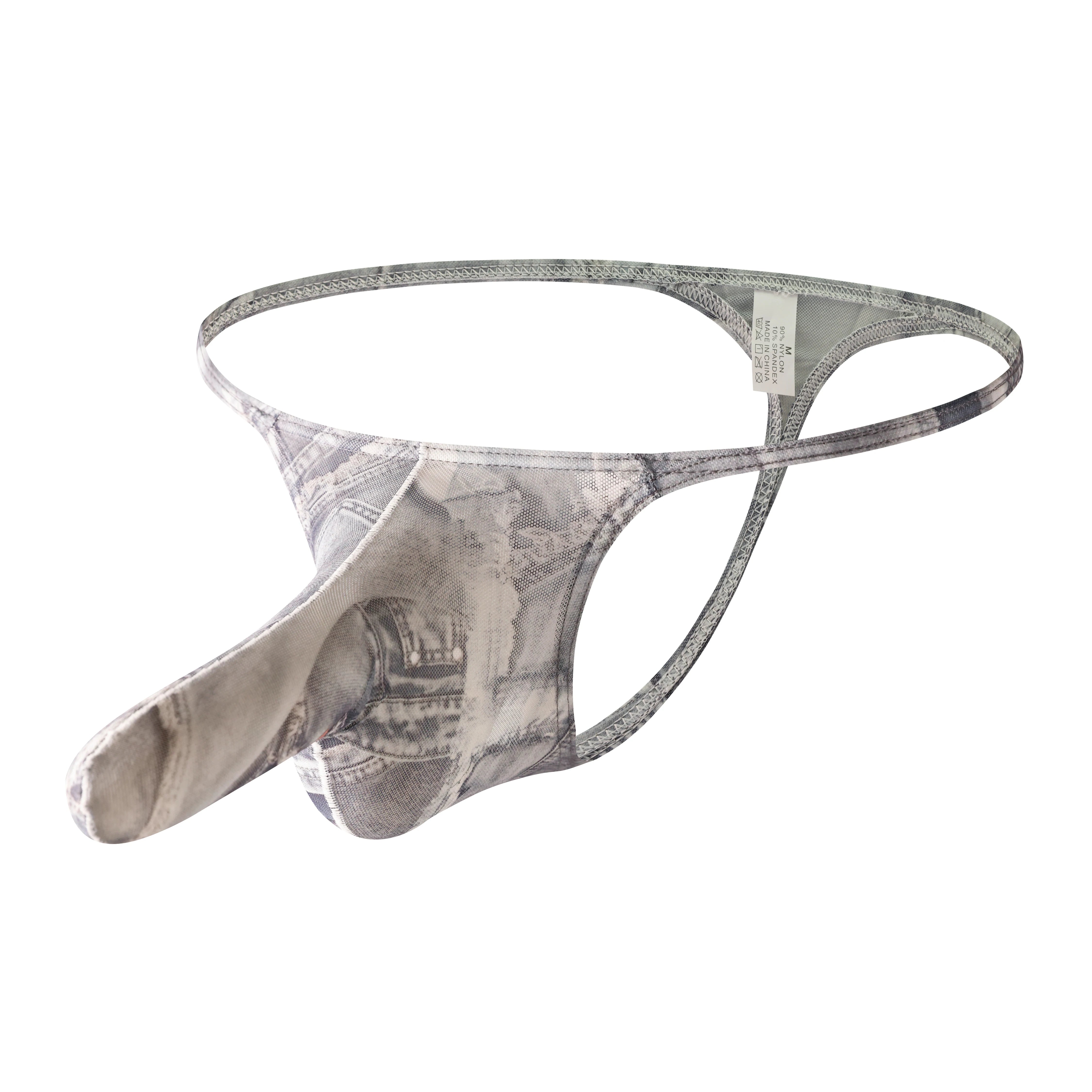 Leave nothing to the imagination in these micro g-strings with an elongated front pouch and denim print design.