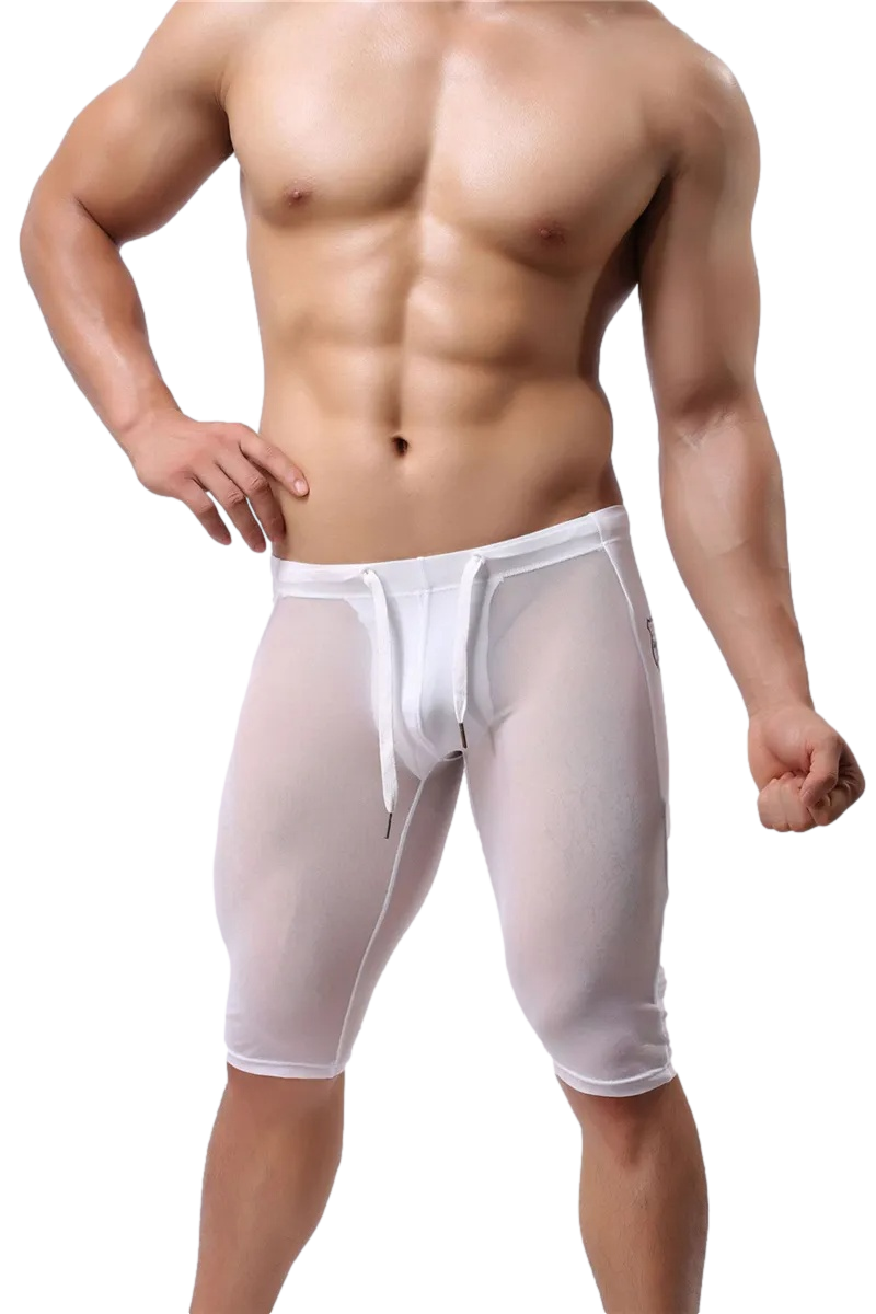 These drawstring knee-length leggings are thin. flexible. and see-through. They are made with a light fabric blend that will stretch to hug your body and show off your legs and rear. Perfect for?guys who want a form-fitting pair and have nothing to hide.