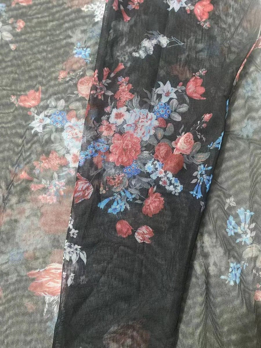 sheer mesh see through print long sleeve crewneck top