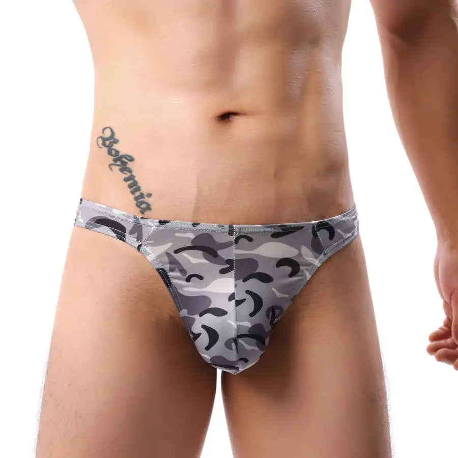 Get ready for action in this camo thong with a convex bulge pouch won't hide much.